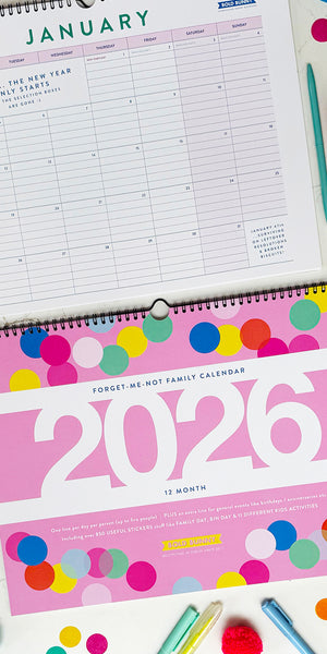 The 2026 Forget-Me-Not Family Calendar is here! ... Think of this planner as the 'Madonna' of calendars, with even more nifty stickers and a new colourway each year. It evolves each time to keep things interesting, but at the core, is still the most ideal piece of lifesaving, get your sh*t together kit, those savvy Mamas & Papas in the know, have grown to not be able to live without... This puppy, will sort you and your family's schedule out for the year. Without it, be prepared to forget play dates, appointments and all the other important stuff...